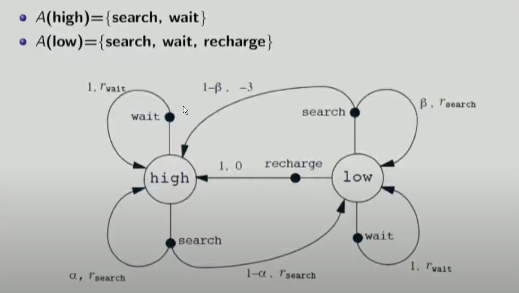 몇가지 살펴보면, 배터리 상태가 high일 때 wait action을 취하면 1의 확률로 high가 유지되고, 이로 인해 r(wait)의 reward가 주어진다.